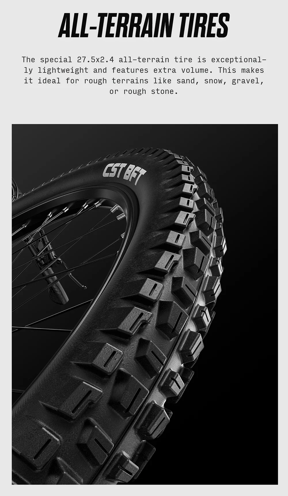 Los neumáticos CST de 27.5″ x 2.4″ ofrecen un agarre excepcional sobre tierra, grava y senderos de montaña. Su perfil ancho proporciona estabilidad y tracción en terrenos blandos o húmedos, mientras que el diámetro de 27.5 pulgadas garantiza una maniobrabilidad ágil y precisa.